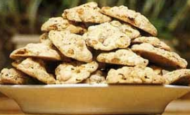 Scald the almonds in boiling water and peel them. Then toast the almonds in the oven. In a heatresistant container, beat the three egg whites until peaks are formed, fold in the sugar and set the container on the top of a double boiler. When the sugar has melted, add the almonds and, keeping the container over the heat, pour in the floor. Mix until a well compact mixture is obtained. Drop spoonfuls of this butter onto a buttered, floured baking sheet. Let brown in an oven al 180°C. Serve cold.