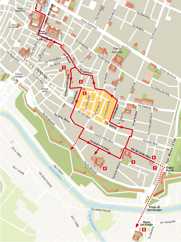 Castello Estense, Piazza Savonarola, Palazzo Municipale, Palazzo Arcivescovile, Cattedrale, Palazzo Paradiso (1), Chiesa di San Gregorio (2), Casa di Stella dell'Assassino (3), Monastero di San'Antonio in Polesine (4), Palazzo Costabili - Museo Archeologico Nazionale (5), Via XX Settembre (6), Casa di Biagio Rossetti (7), Chiesa di San Giorgio (8).